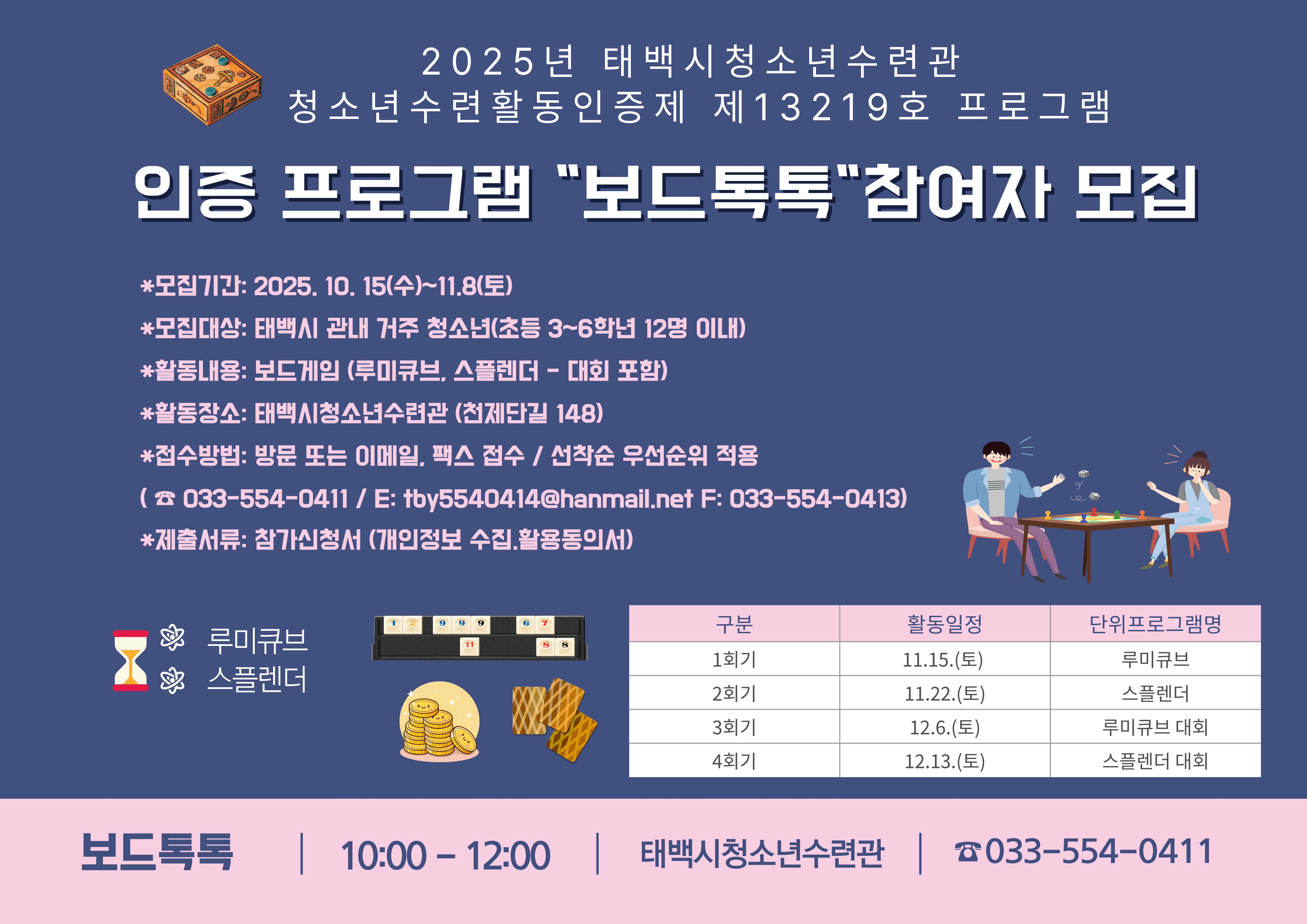 2025년 태백시청소년수련관 청소년활동인증제 제13219호 인증 프로그램[보드톡톡]참가자 모집 1. 모집대상: 태백시 관내 거주 청소년(초등 3~6학년 12명 이내) 2. 모집기간: 2025. 10. 15.(수)~11. 8.(토) 18:00까지 3. 활동기간: 2025. 11. 15.(토), 22.(토), 12. 6.(토), 13.(토)-4회기 4. 활동내용: 보드게임(루미큐브, 스...